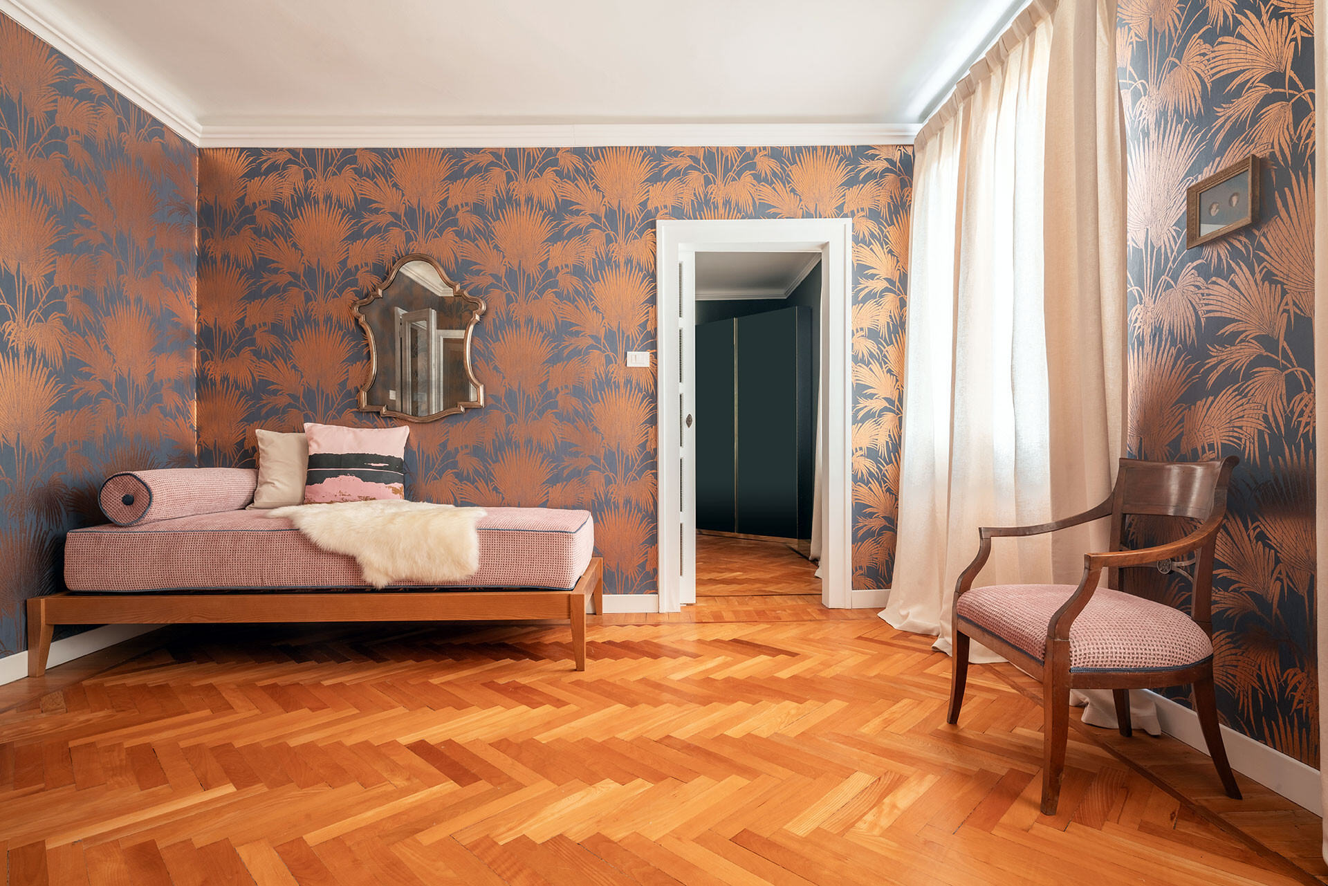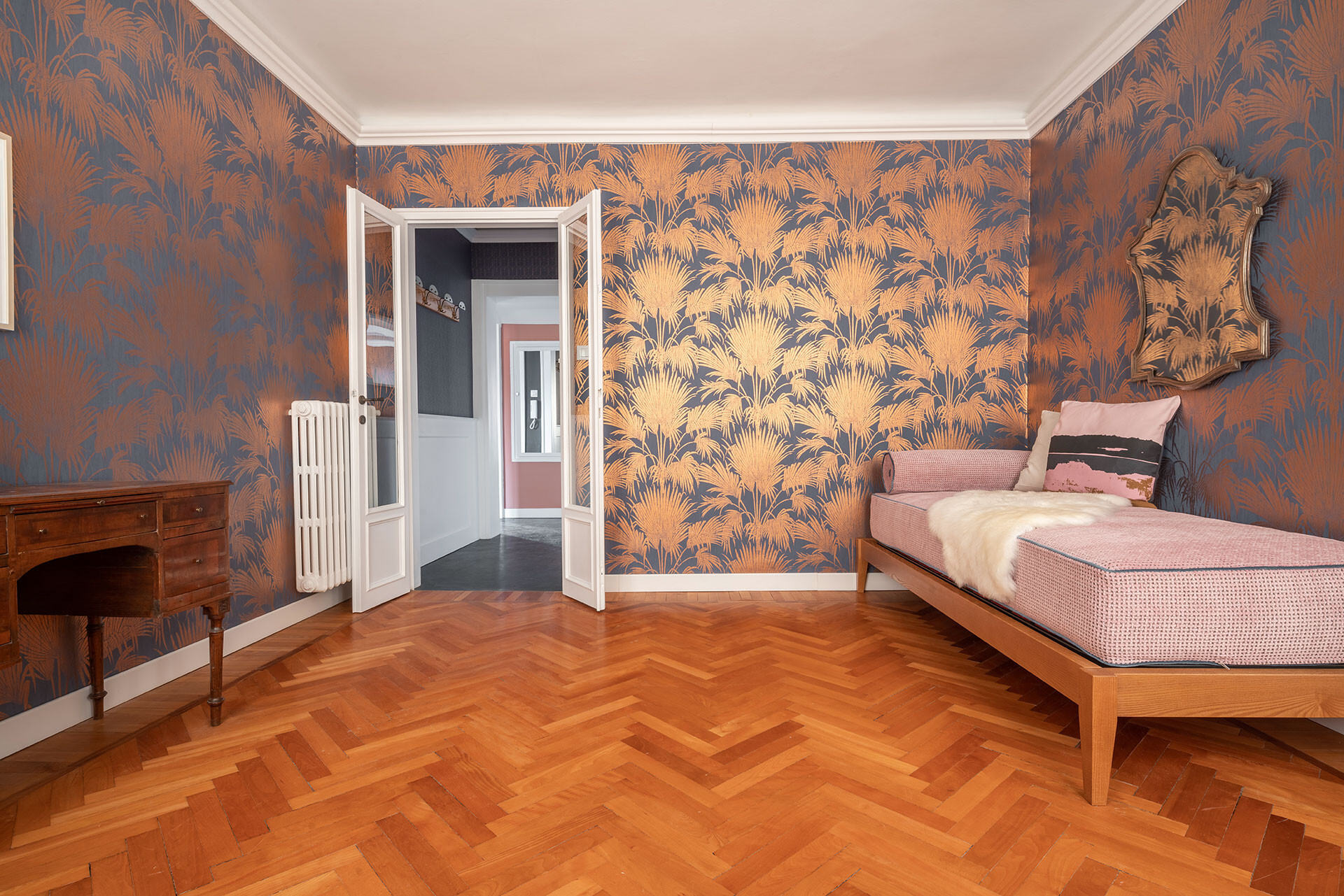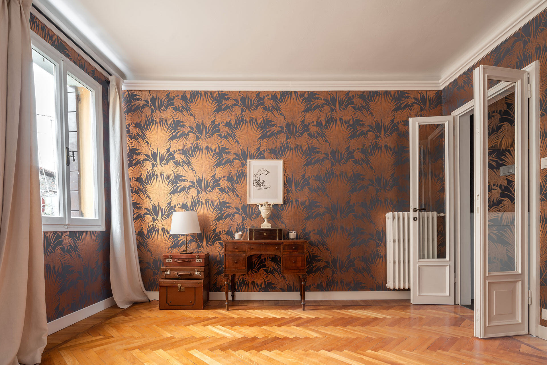 It is found at the 4th floor of a historic building with a large and easy to climb stairway, so don’t be worried for the steps. It is full of natural light and features open views over the rooftops of Venice. Its eclectic charm is conferred by mid-century modern furniture smartly blended with traditional architectural features such as wooden beamed ceilings, fishbone parquet flooring and luxurious wall finishing. The interior design project is ambitious as for the use of colours: the result is a distinctive and inspiring ambience.