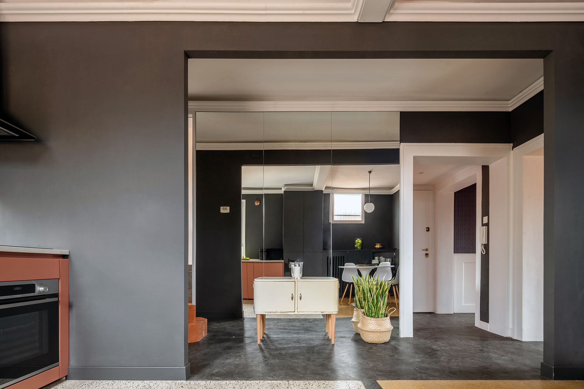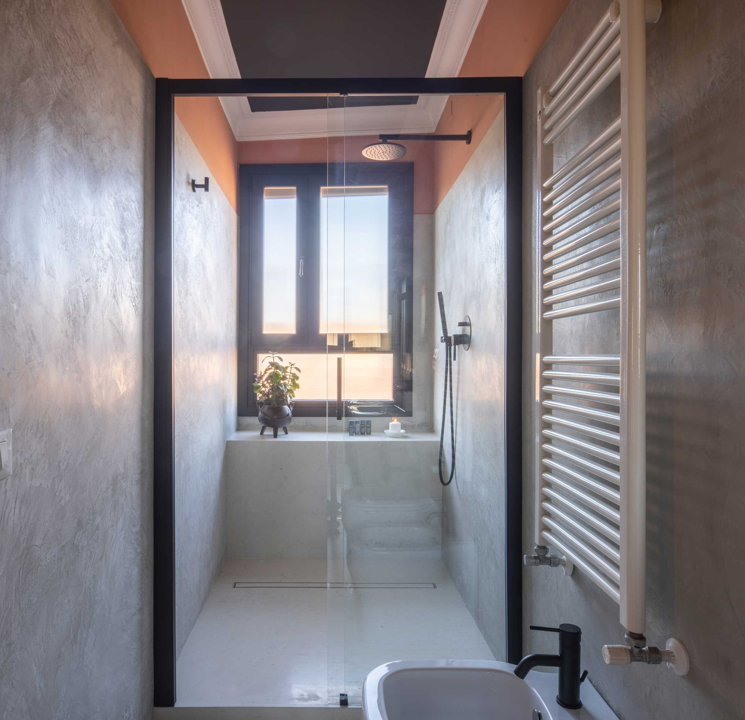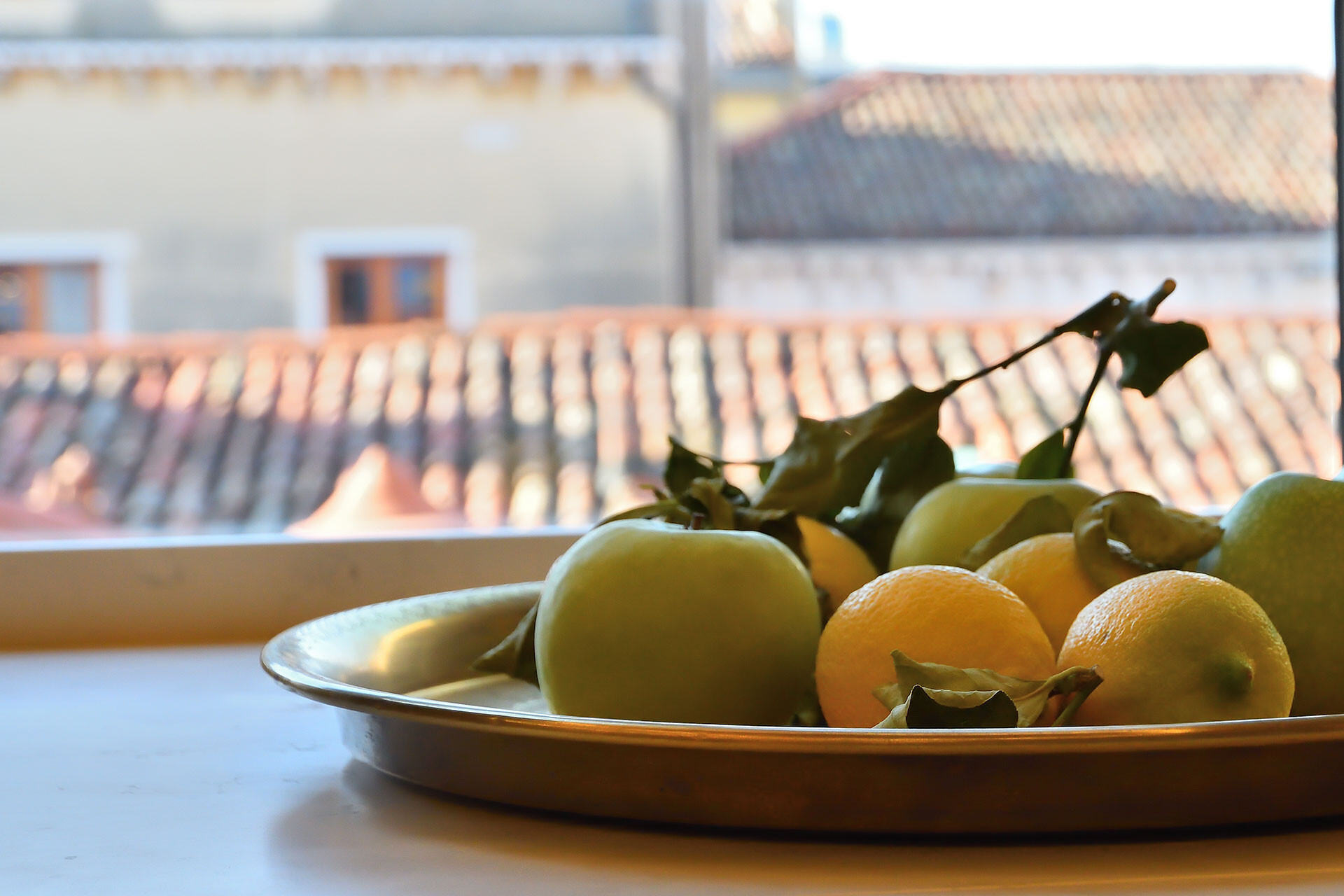 It is found at the 4th floor of a historic building with a large and easy to climb stairway, so don’t be worried for the steps. It is full of natural light and features open views over the rooftops of Venice. Its eclectic charm is conferred by mid-century modern furniture smartly blended with traditional architectural features such as wooden beamed ceilings, fishbone parquet flooring and luxurious wall finishing. The interior design project is ambitious as for the use of colours: the result is a distinctive and inspiring ambience.