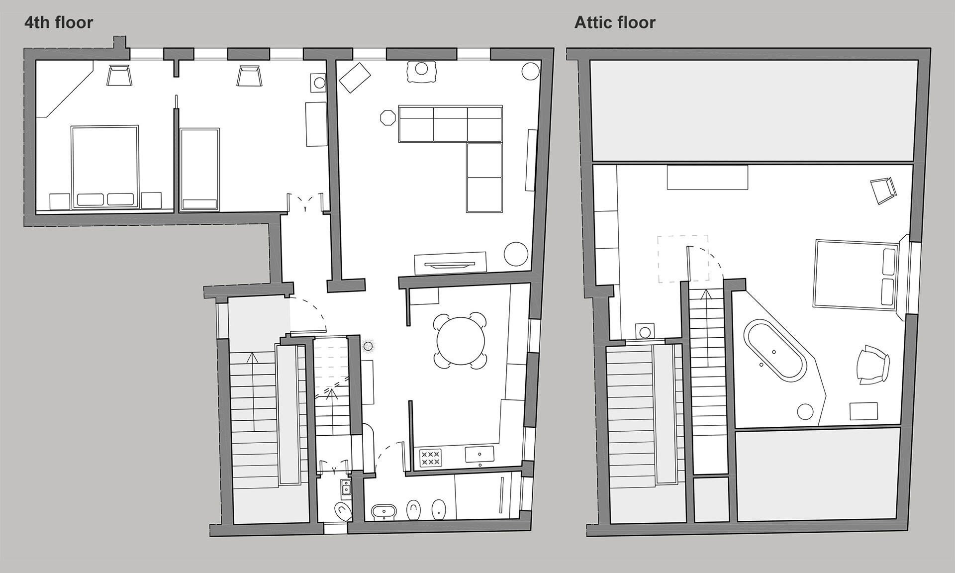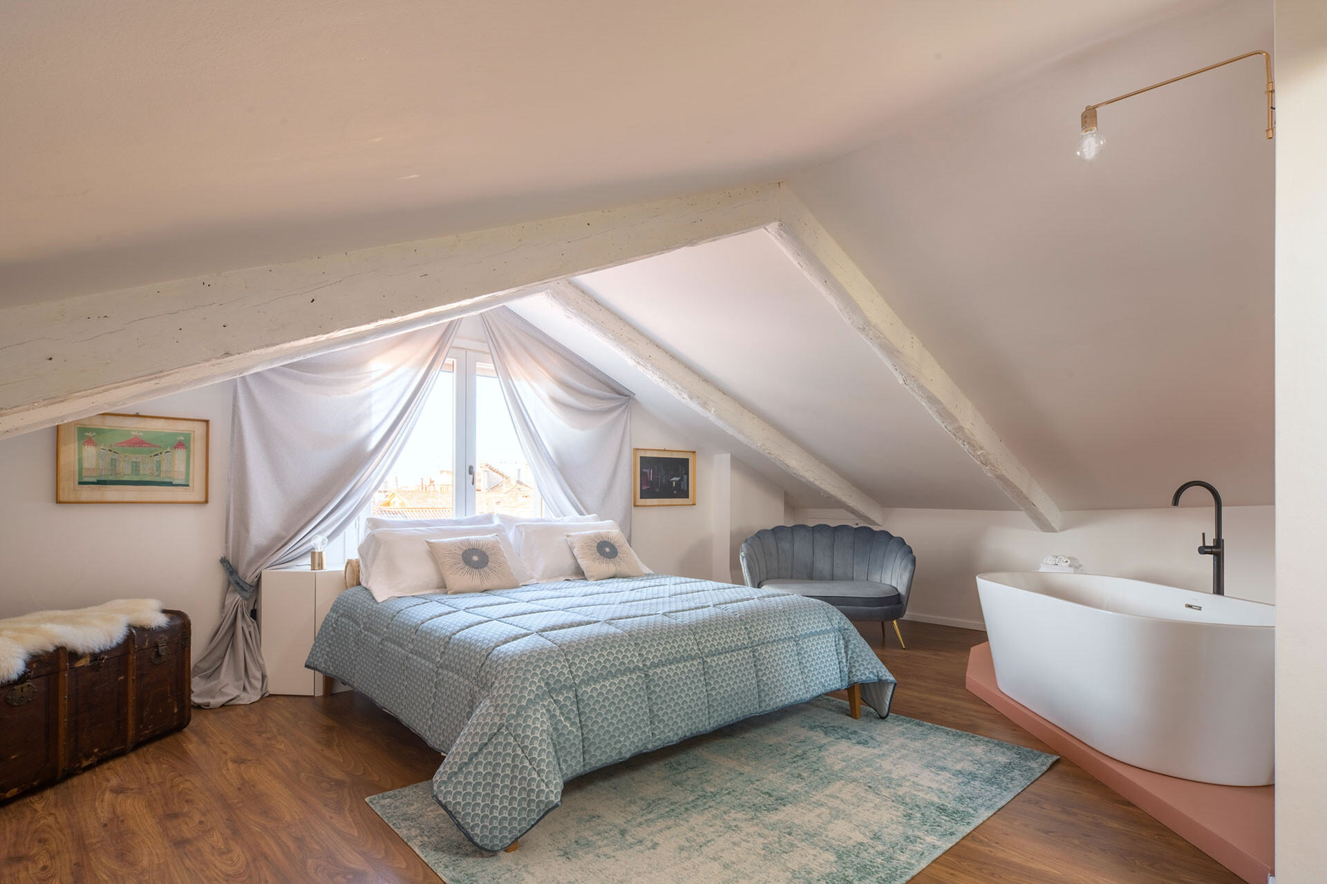 Beside the location and the exquisite interior design, the great plus of the Verdi apartment is definitively the stunning bedroom in the attic level, a loft with king-size bed, free-standing bathtub and panoramic view.