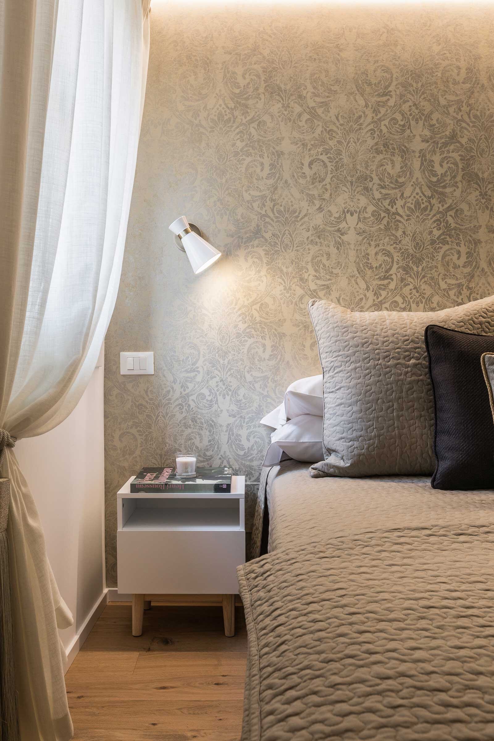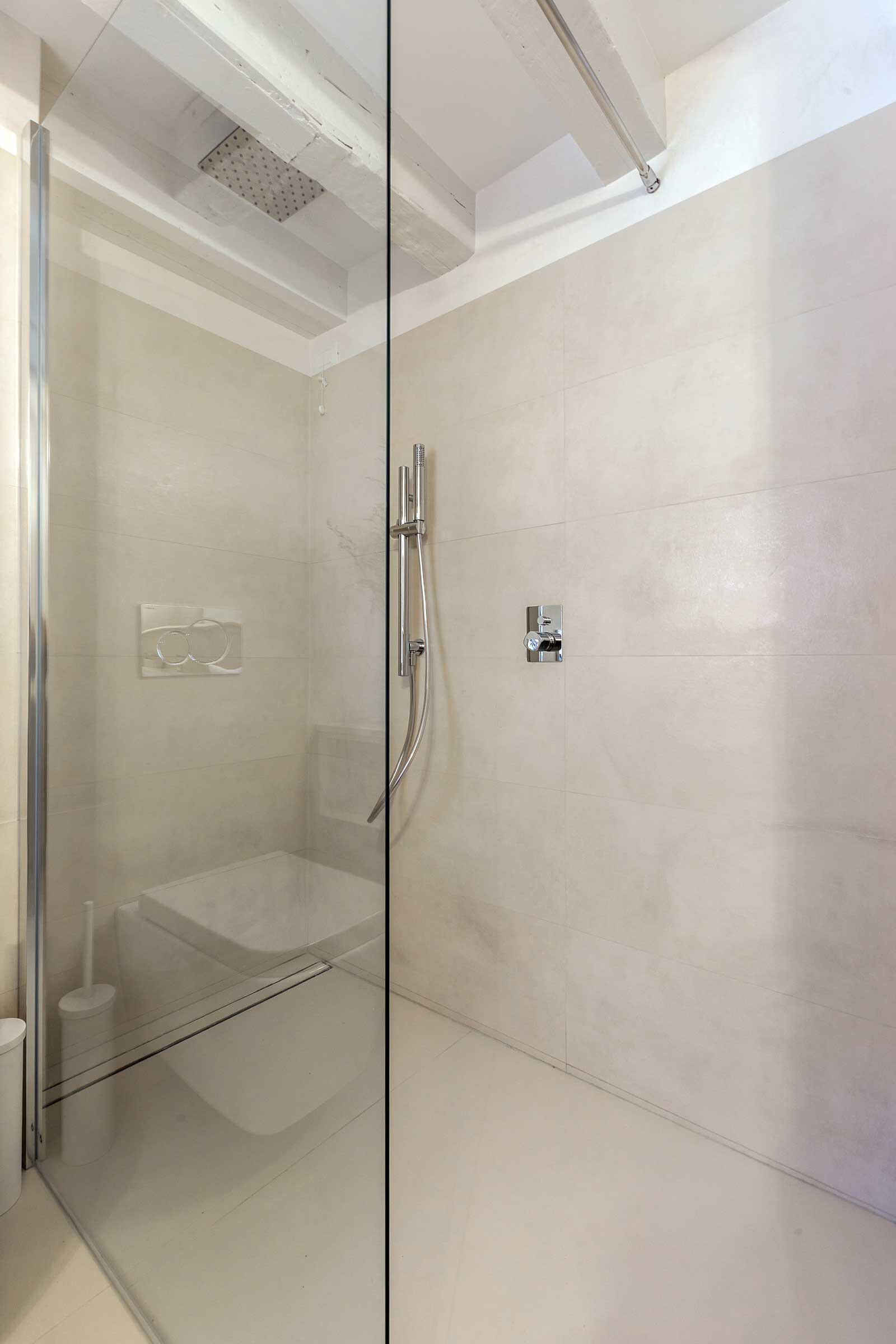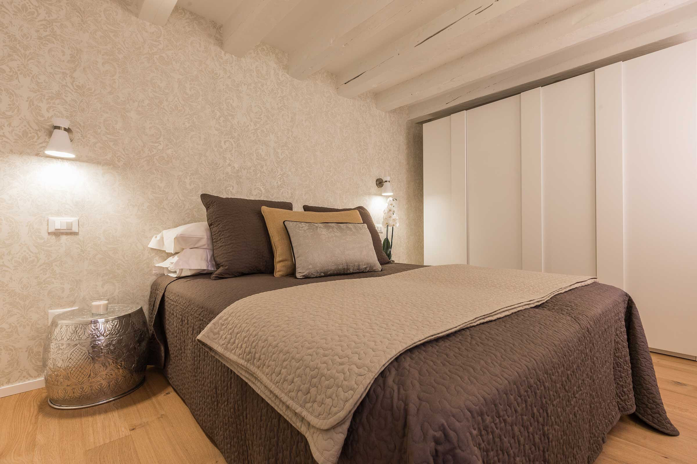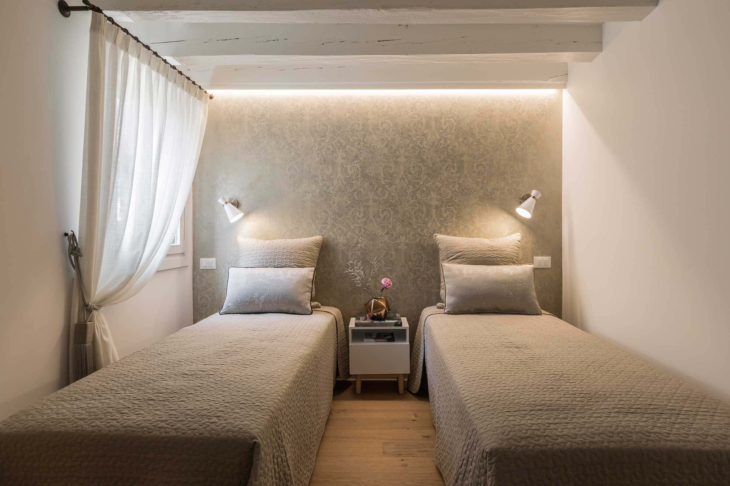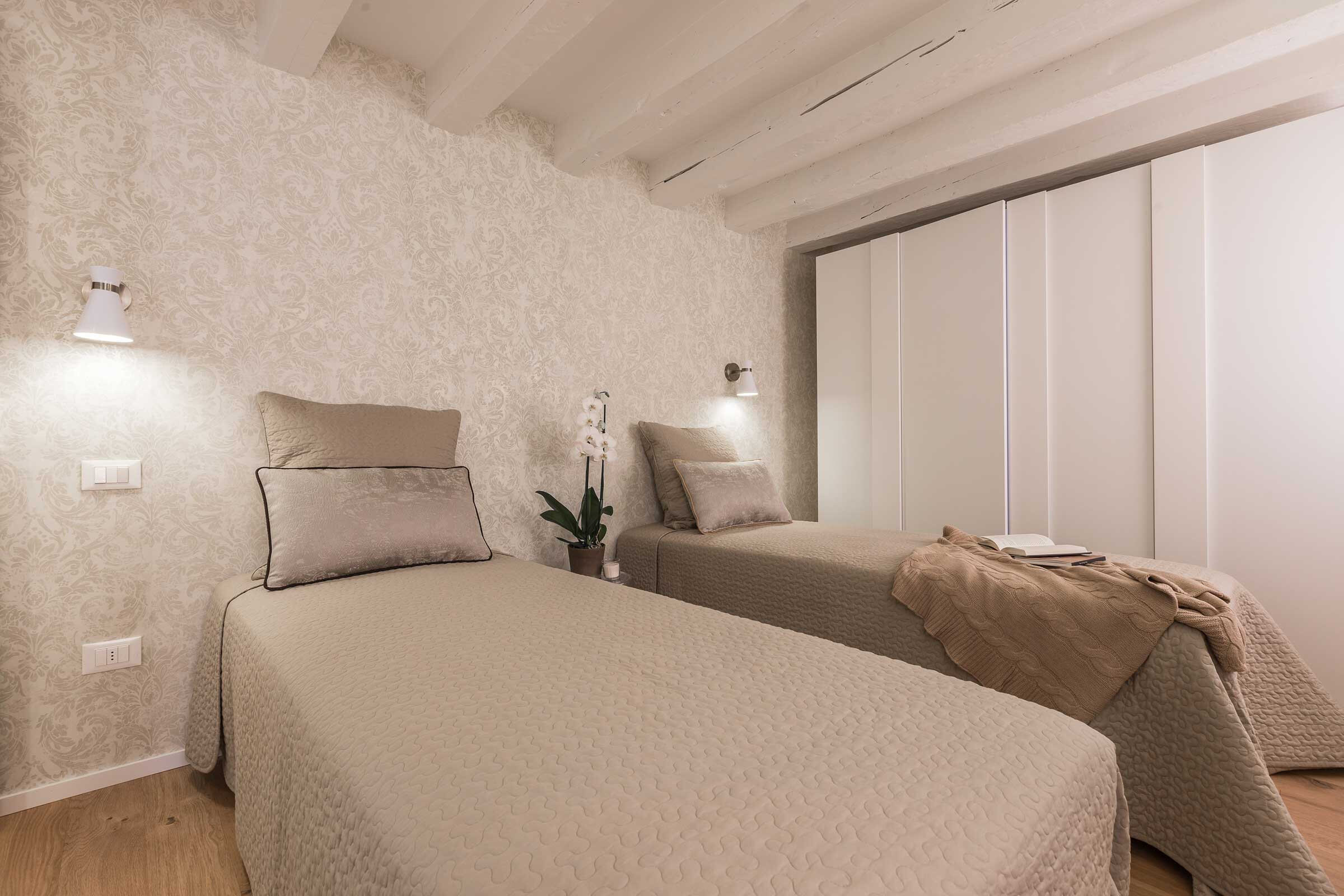 Wallpapers evoke Venice’s history and the glorious Damascene silks of the trading era. The open-beamed ceiling and skylight expand the sense of space and airiness. The sleek marble top dining table and designer chairs add comfort and panache. Each bedroom has a king bed that can be set up as two singles if requested. The wardrobes offer ample hanging and storage space. One very attractive bathroom with a large walk-in glass shower serves the two bedrooms.